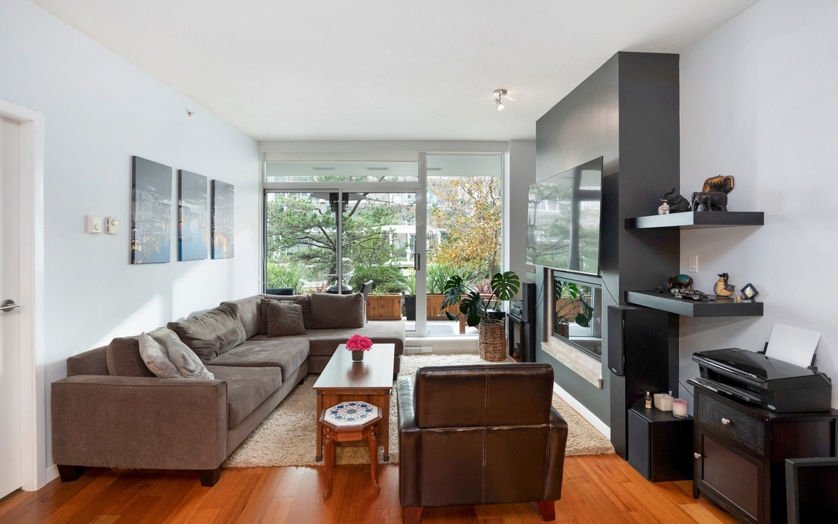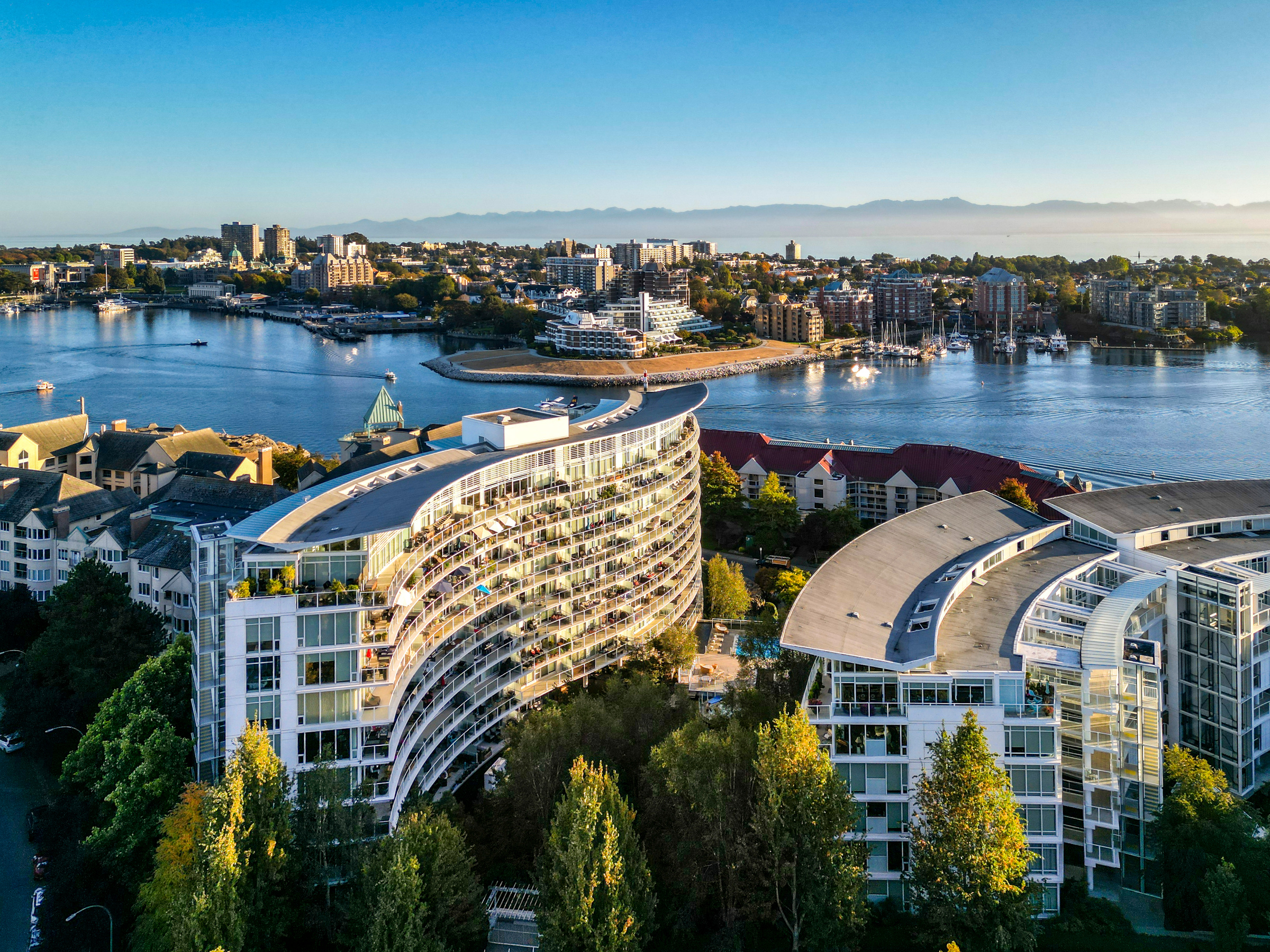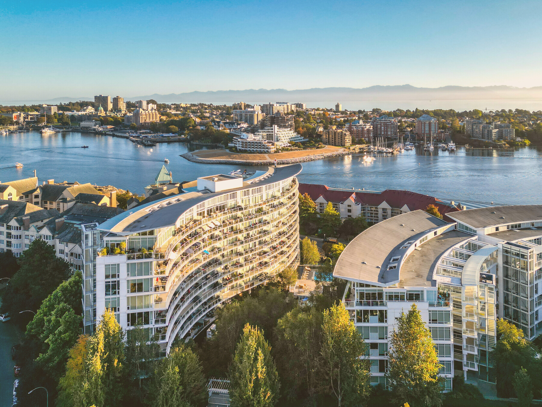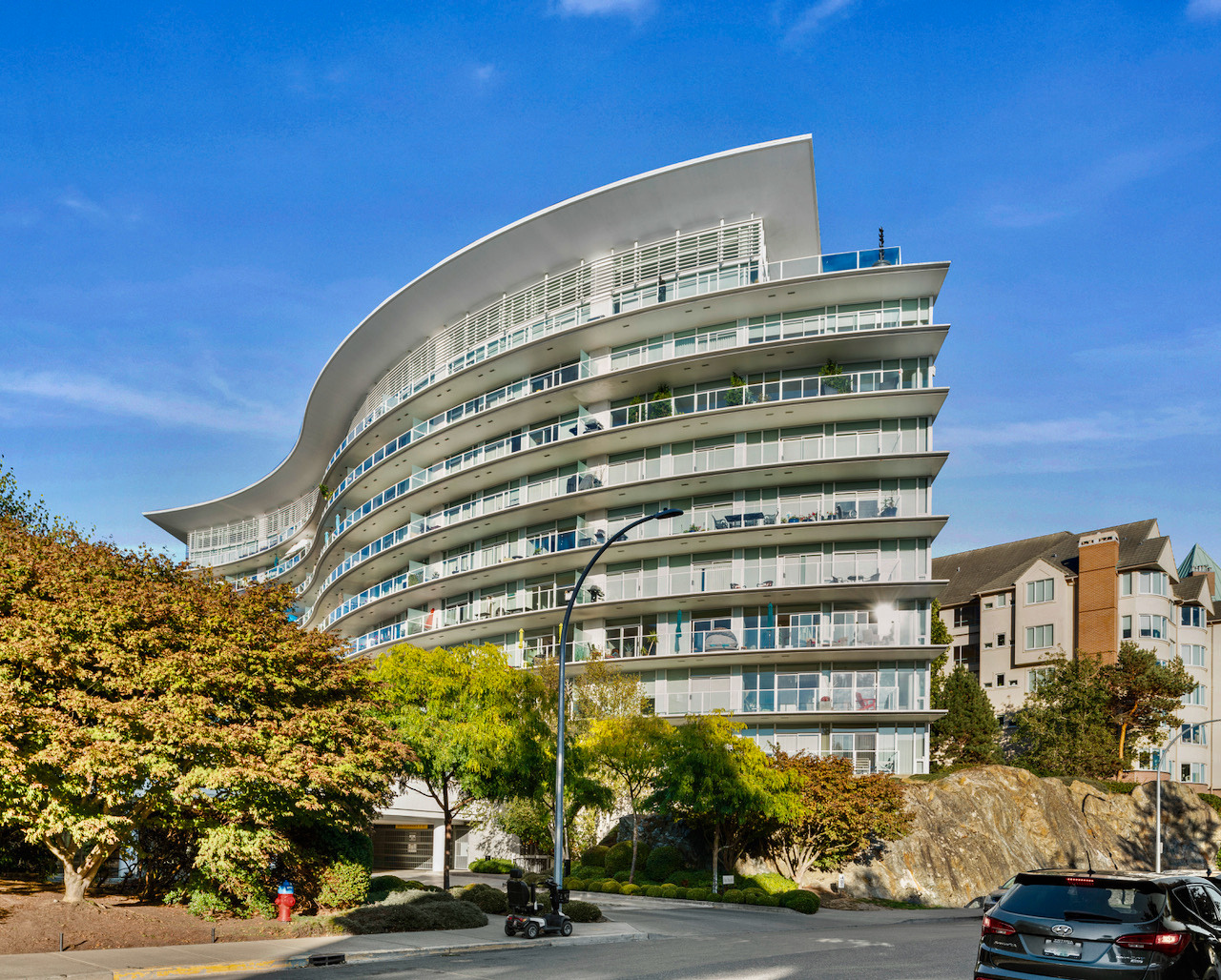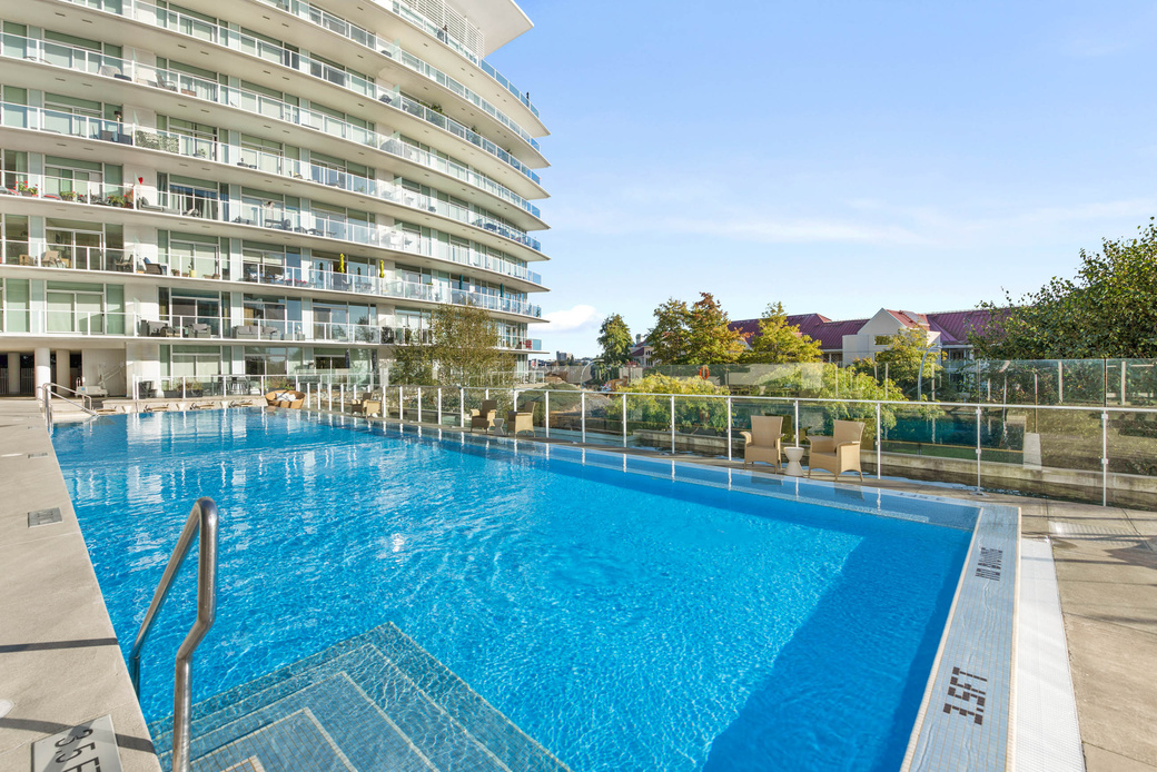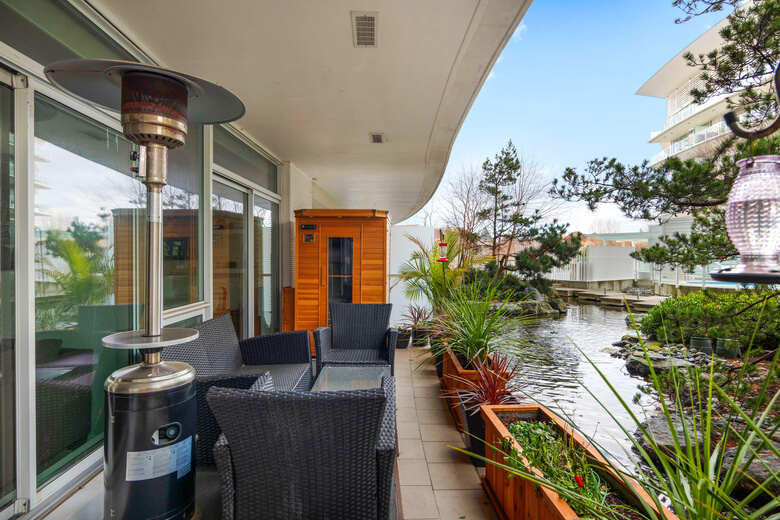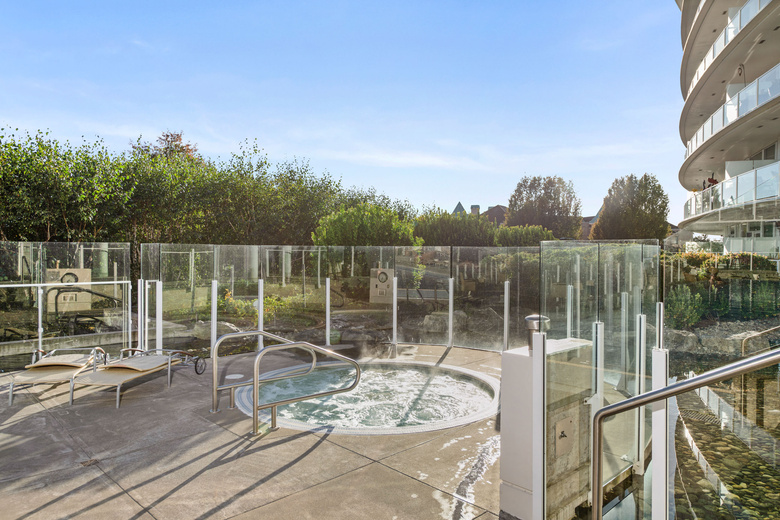 This gorgeous condo is located on the ground floor with a fabulous entertainment-sized balcony overlooking the beautiful, tranquil water gardens and inner courtyard, perfect for relaxation and entertaining. The kitchen comes complete w/granite countertops, high-end SS appliances, and gas stove. The spacious primary bedroom offers a large walk-in closet and a spa-like ensuite. This stunning complex has outstanding amenities including a 75ft heated outdoor pool, 2 hot tubs, steam room, sauna, fitness centre & guest suite. Pet-friendly and no size restrictions for dogs allowing for furry friends to be a part of the luxurious lifestyle. Perfect location only minutes to the ocean, downtown, shopping, amazing restaurants and the beautiful Songhees walkway. It is a dream come true for those seeking the perfect blend of relaxation and city living.